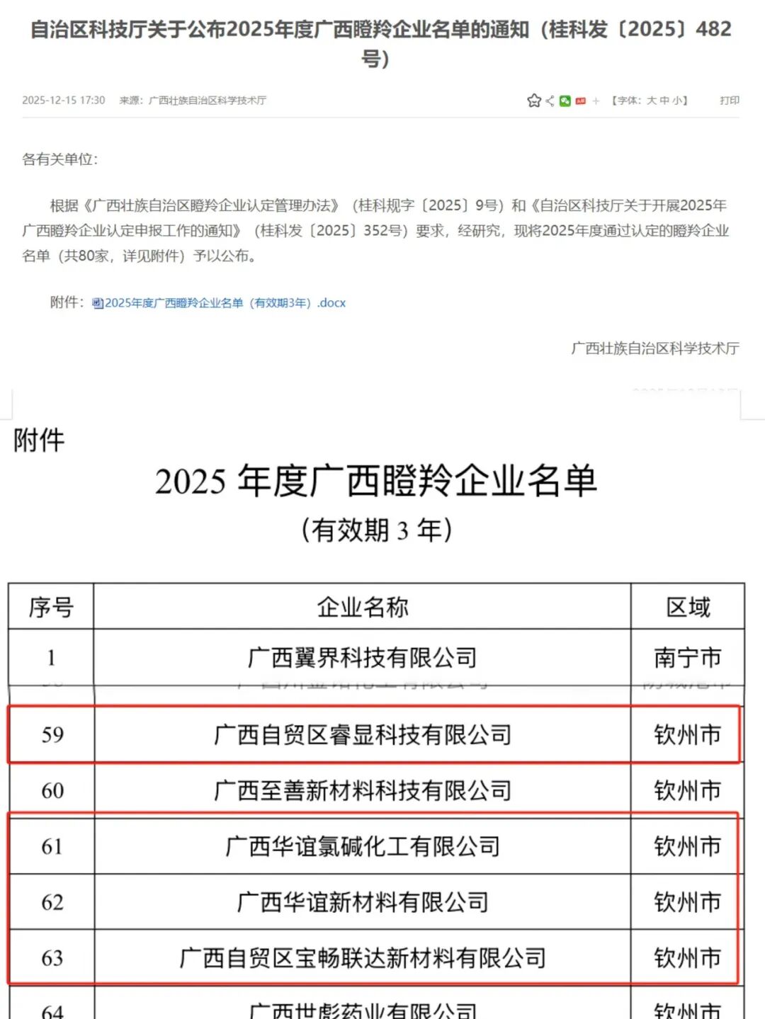 近日,自治区科技厅发布2025年度广西瞪羚企业名单,钦州有6家企业入选,其中中马钦州产业园区有4家,分别是:广西自贸区睿显科技有限公司、广西华谊氯碱化工有限公司、广西华谊新材料有限公司、广西自贸区宝畅联达新材料有限公司。年度新增瞪羚企业数量创下园区自成立以来的历史新高,标志着园区在培育高成长性科技企业、打造创新产业集群方面迈上新台阶。