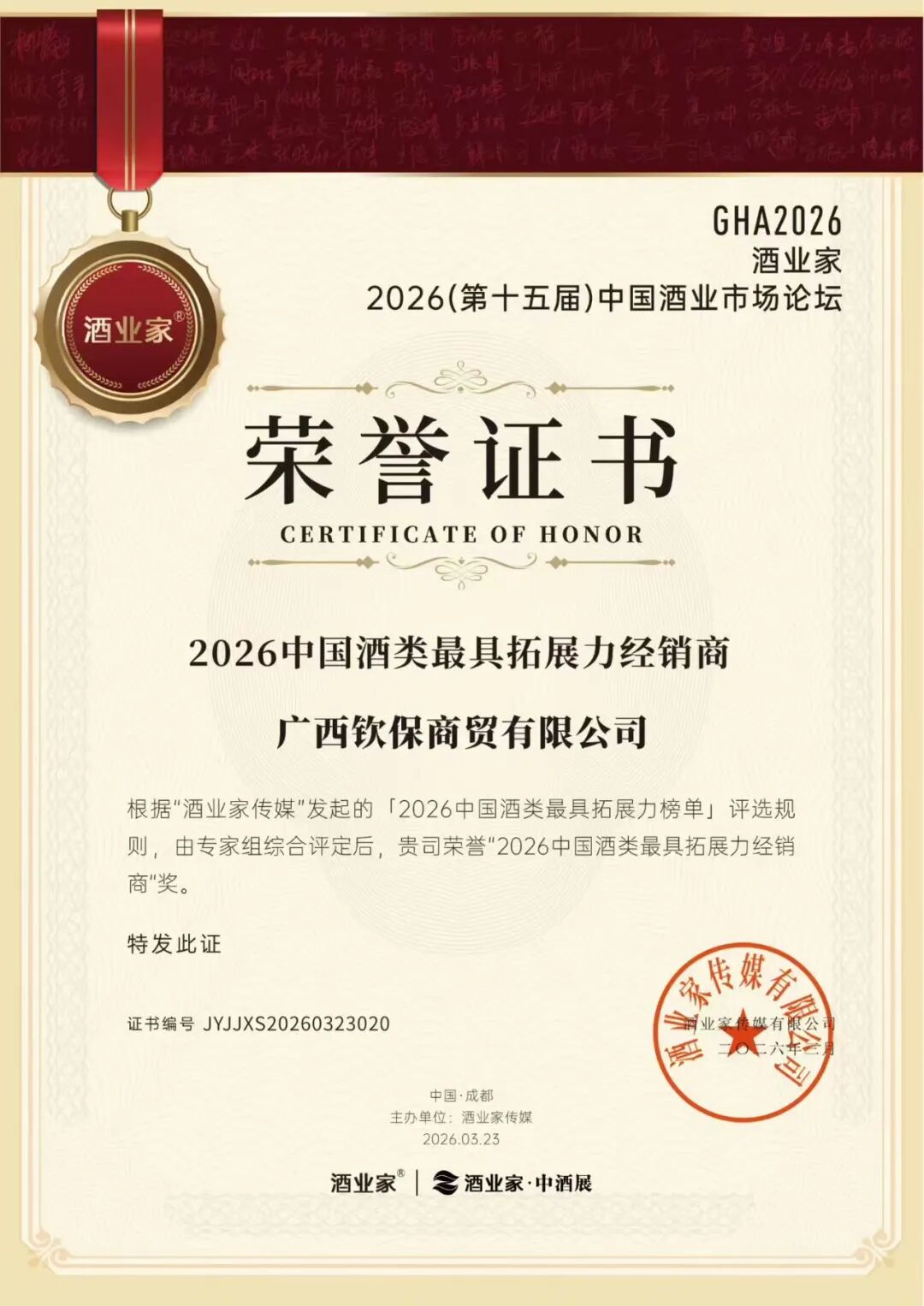 近日,第十五届中国酒业市场论坛于成都圆满落幕。广西钦保商贸有限公司凭借其高端酒类连锁品牌“盛选铭酒”亮眼的市场拓展能力与综合品牌建设实力,斩获“2026中国酒类最具拓展力经销商”荣誉。这是钦保商贸公司自重组设立后斩获的首个重要的行业荣誉,这份来自酒类第一垂直媒体的权威认可,是行业对钦保商贸公司酒类领域品牌建设与服务创新的高度肯定。