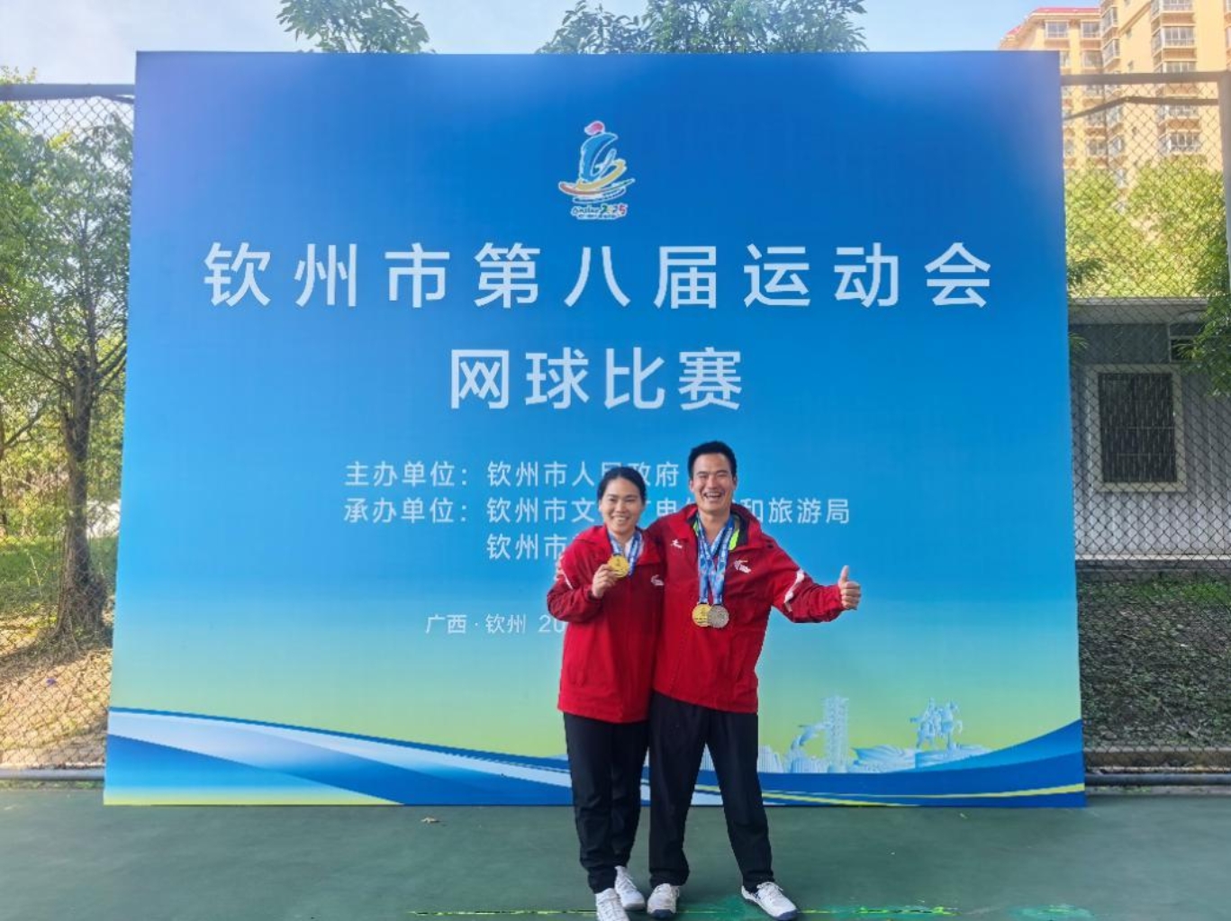 网球混合双打赛场上,香渭义/陈丽萍组合凭借精准的落点把控、灵活的战术调配及关键时刻的稳定发挥,在多轮胶着对决中顶住压力,多次化解对手赛点危机,最终以坚韧斗志斩获冠军。男子单打赛场中,香渭义依托强劲的发球优势与稳健的底线相持能力,扛住多轮高强度鏖战,面对实力出众的对手毫不怯场,成功赢得亚军。值得关注的是,中马钦州产业园区党工委副书记、管委会常务副主任毛任建亲自出战,与队友携手征战男子双打赛事,一路过关斩将,闯进半决赛,是冠军的有力争夺者,后因公务繁忙,无法继续参赛,遗憾止步四强。