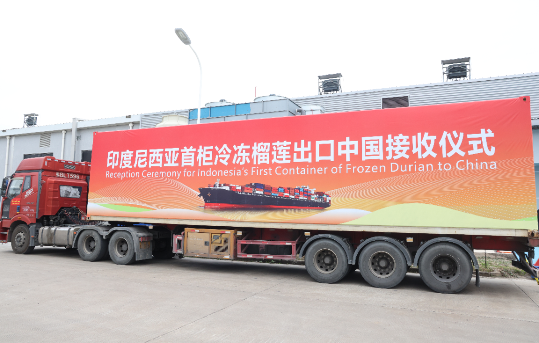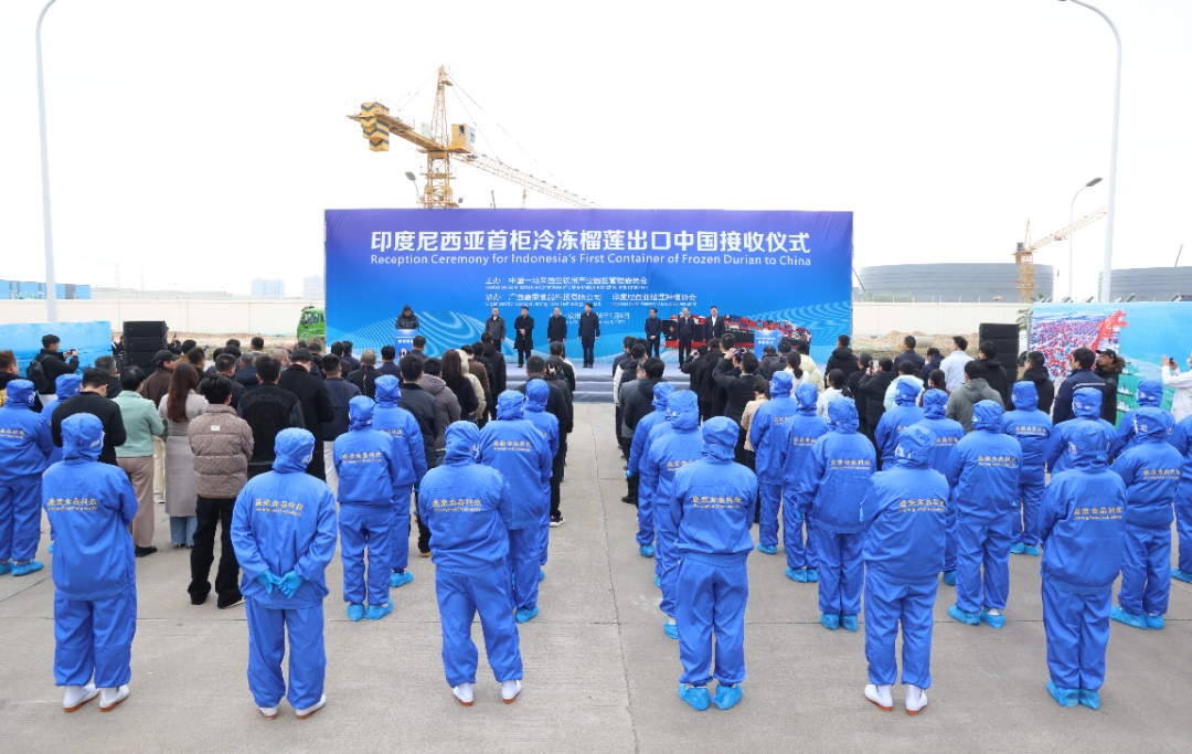 印度尼西亚首柜冷冻榴莲出口中国接受仪式现场。