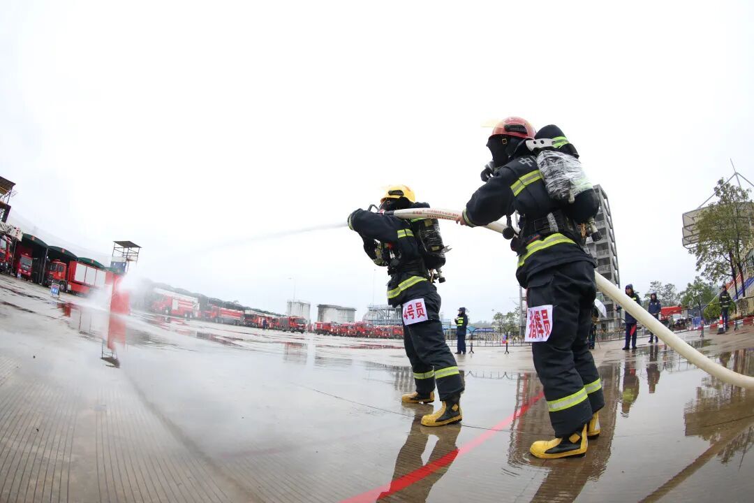 比武竞赛——枪炮协同灭火操作。此次竞赛紧扣实战需求,设置了救援技能、负重登楼、400米物资疏散等多个科目,既考验指战员的体能极限与专业技能,也检验团队协同作战能力。赛场上,队员们精神抖擞,攀爬挂钩梯时动作利落如飞,负重转运物资时分秒必争,模拟救援中配合默契高效,每一个环节都彰显出日常训练的扎实功底。