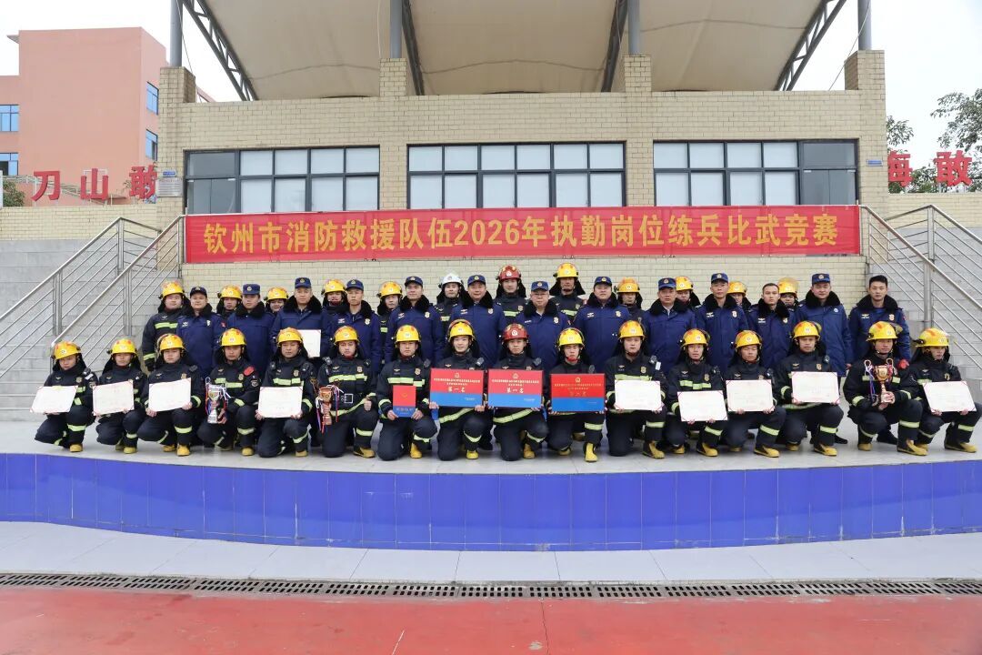 近日,钦州市消防救援支队组织开展2026年度执勤岗位练兵比武竞赛,中国—马来西亚钦州产业园区消防救援大队取得团体总分第一名、果鹰大道消防站(鹰岭站)获得国家队组第一名、龙泾大道消防站(龙泾站)获得专职队组第二名的优异成绩。