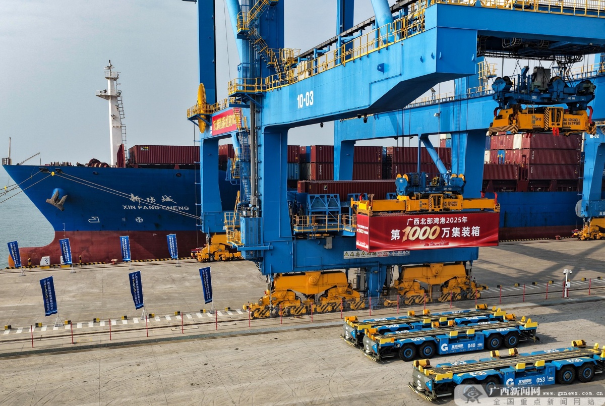 12月30日,北部湾港2025年第1000万个集装箱在钦州自动化集装箱码头10号泊位,被平稳吊装到“新防城”轮上。广西云-广西日报记者 周军 摄