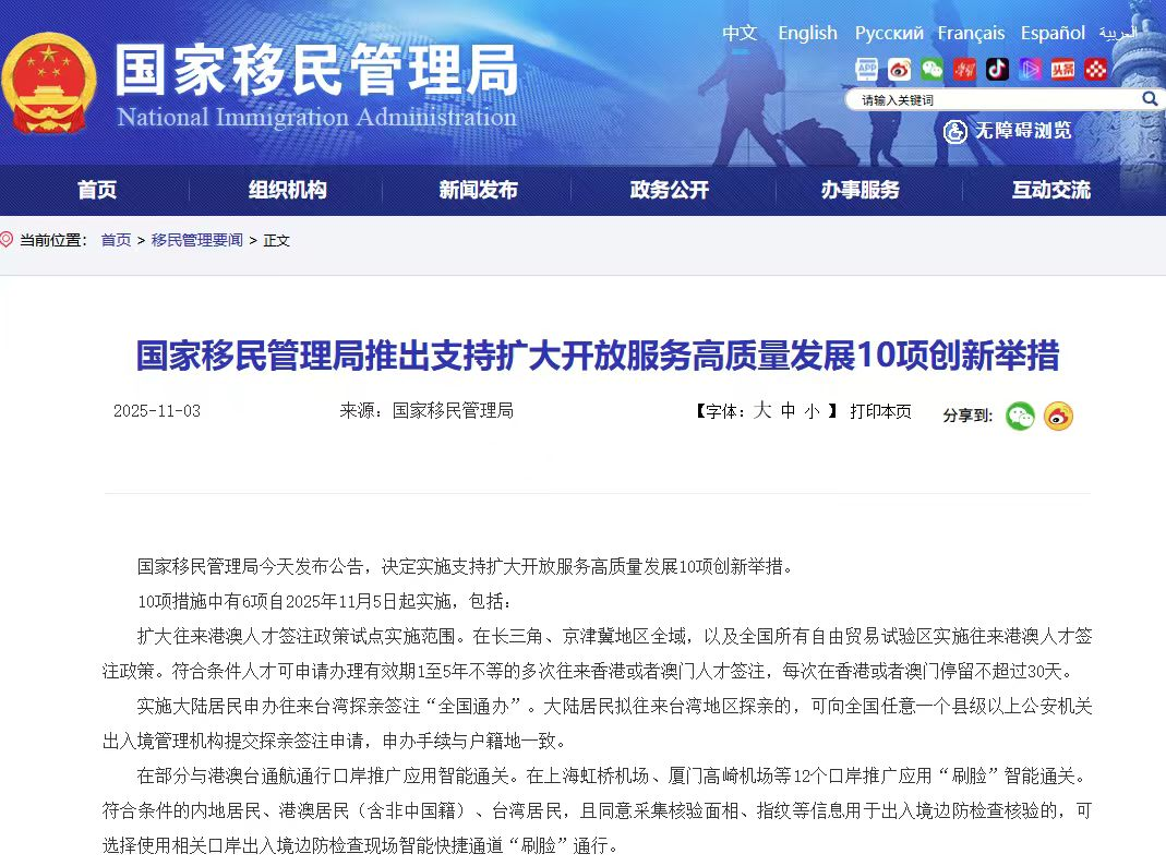为积极服务促进高水平开放高质量发展,2025年11月3日,国家移民管理局(中华人民共和国出入境管理局)发布公告,决定实施支持扩大开放服务高质量发展10项创新举措。其中,自2025年11月5日起,在北京、上海、粤港澳大湾区的基础上,在长三角、京津冀地区全域,以及全国所有自由贸易试验区实施往来港澳人才签注政策。