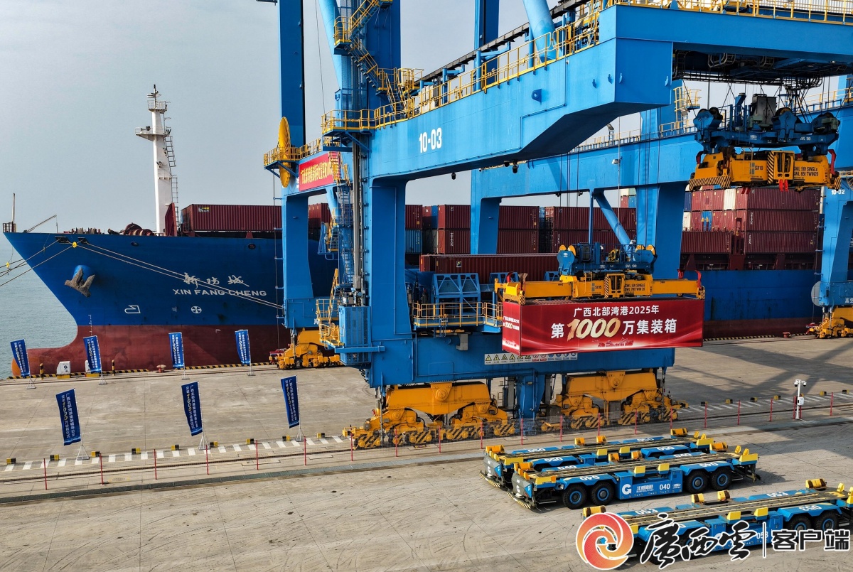 2025年12月30日,北部湾港2025年第1000万个集装箱在钦州自动化集装箱码头10号泊位,被平稳吊装到“新防城”轮上。广西云-广西日报记者 周军 摄