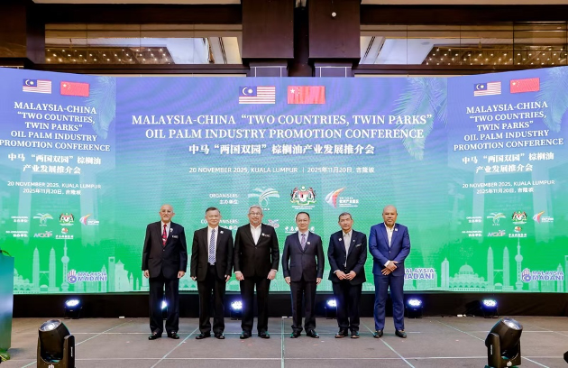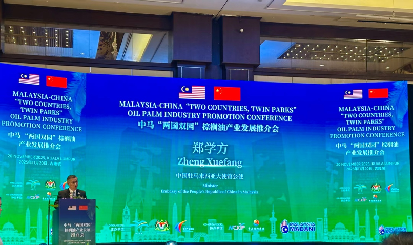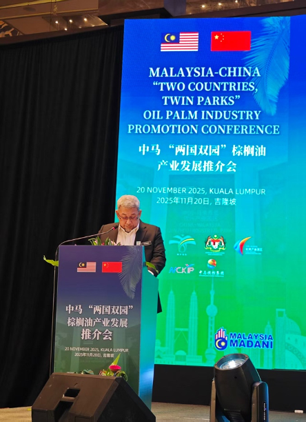 11月20日,中国和马来西亚“两国双园”棕榈油产业发展推介会在吉隆坡举行。驻马来西亚使馆郑学方公使、马来西亚种植原产部秘书长尤斯然、马来西亚棕榈油署主席希尔米以及中马钦州产业园区管委会副主任赵文博出席开幕式并致辞,中马两国棕榈油业界人士约200人出席了推介会。 郑学方公使介绍了中国—东盟自贸区3.0版升级议定书对促进中国—东盟经贸合作的重要意义,表示中方始终把马来西亚作为周边外交的优先方向,在两国领导人战略引领下,双边关系定位已提升至共建高水平战略性中马命运共同体的新高度。中方支持以“两国双园”为平台,强化中马两国在棕榈油产业方面的合作,推动两国棕榈油产业链、供应链向更加高效、绿色和可持续发展。郑宣介了中共二十届四中全会精神和“十五五”规划建议,强调中国将进一步扩大高水平对外开放,中国的发展将为包括马来西亚在内的世界各国共同发展创造更加广阔的合作空间,将推动中马各领域的务实合作不断迈上新台阶。尤斯然秘书长积极评价“两国双园”平台发挥的作用,表示这与马来西亚“昌明经济”构建可持续、具有竞争力的全球供应链愿景完全契合。棕榈油是一种战略资产,马来西亚将与中国携手构建绿色、具有韧性的棕榈油供应链,进一步深化马中经贸互利合作。希尔米主席表示,在马中两国棕榈油产业合作中,棕榈油署将利用其科研技术优势,为提升产业附加值和打造绿色产业链发挥积极作用。赵文博副主任介绍了园区棕油项目投资情况,表示将为中马棕榈油产业链的合作提供智能解决方案。
