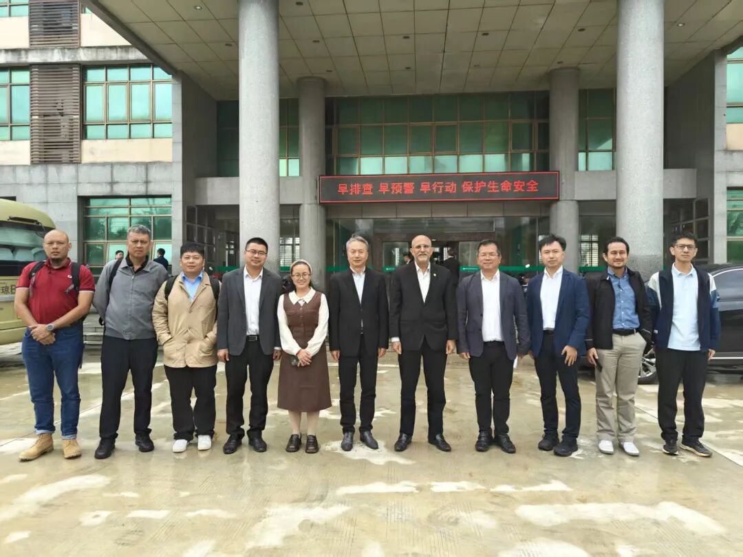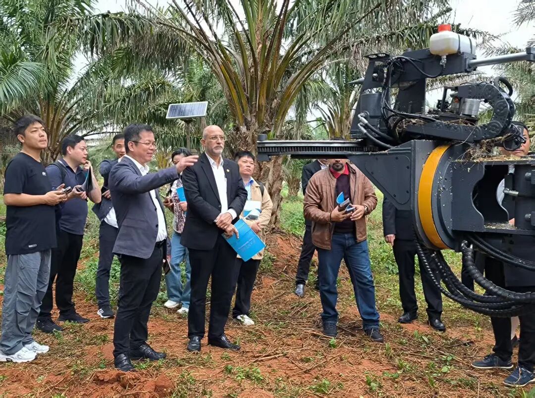 ▲公司总裁陈思进(前排左一)与拿督巴威斯博士(前排左二)一行实地观摩采摘设备作业演示
