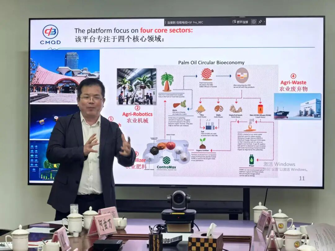 11月30日,中马合资公司总裁陈思进、首席财务官江俊豪率队赴海南,在中国热带农业科学院椰子研究所油棕研究中心(以下简称“海南油棕研究中心”)主任曹红星陪同下,向来华调研考察的马来西亚油棕机械化与自动化研究联盟(MARCOP)主席罗斯林及棕榈油总署(MPOB)署长拿督巴威斯博士一行,专题推介了中国—东盟(绿色棕榈产业)人工智能创新合作平台(以下简称“平台”)项目。此次活动是继11月20日吉隆坡“两国双园”棕榈油产业发展推介会后,中马双方在棕榈产业链合作领域的又一重要实践。