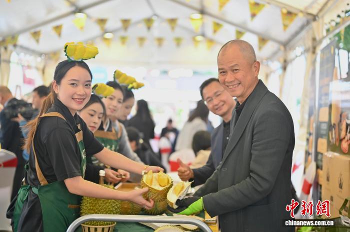 中新社南宁11月21日电 (俞靖 杨陈)首届“2025榴莲大哥(DSR)榴莲节”21日在广西南宁启动,来自马来西亚的榴莲鲜果以及榴莲雪糕等产品亮相当地热门商圈,吸引众多食客。
