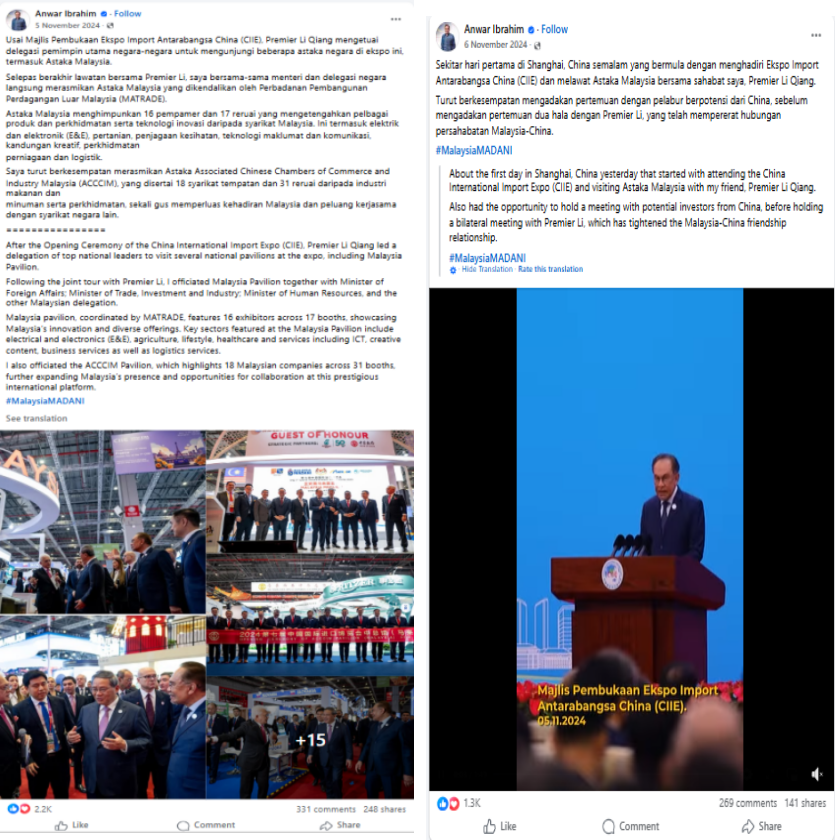 马来西亚总理安瓦尔参加进博会后在个人脸书账号上发布推文